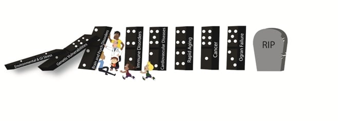 As research suggests, once environmental stressors are triggered (domino #1), which interact with our genetic vulnerabilities (domino #2), often the next domino to fall is our brain, which includes psychiatric and neurological disorders.  For instance, autism is doubling approximately every 5 years and it is likely that by 2040 at the current rate of increase, that most children in the US will suffer from autism or some variation of childhood spectrum disorder.  About 50% of the people you interact with will suffer from a diagnosable mental disorder in the next year, and addictions, especially to Fentanyl and opioids are increasing rapidly. All addictions to alcohol, illicit and prescribed drugs continue to cause hundreds of thousands of deaths per year.  Dementia and neurological disorders in the elderly are also increasing but at a slower pace.  Life expectancies in the United States continue to decline over the last several years.